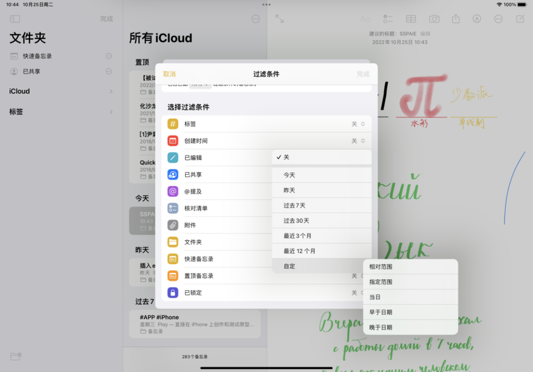 此外,备忘录的整理归档也得到了一定程度的改进。现在在默认情况下,所有备忘录按更新日期被归类到了一起,比如「今天」「近 7 天」「近 30 天」等。另外,在文件夹创建的过程中,我们可以使用许多过滤条件来创建「智能文件夹」,除了能够将以往创建的备忘录按条件筛选外,还可以把今后创建的备忘录自动归类。