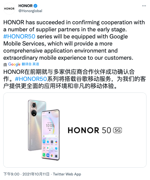 昨日晚间,荣耀海外平台官宣与谷歌已恢复合作,接下来的 HONOR 50 系列海外版本将搭载Google Mobile Services(GMS)。荣耀从年初开始就与谷歌进行谈判希望恢复合作关系,到几个月前开始接受 Google 的安全审查和兼容性测试,旨在确保接下来荣耀设备能运行 GMS 应用程序。荣耀终端有限公司 CEO 赵明表示荣耀已在全球 50 多个国家逐步恢复了业务的运作,未来更多的产品也会支持谷歌的 GMS 的服务。