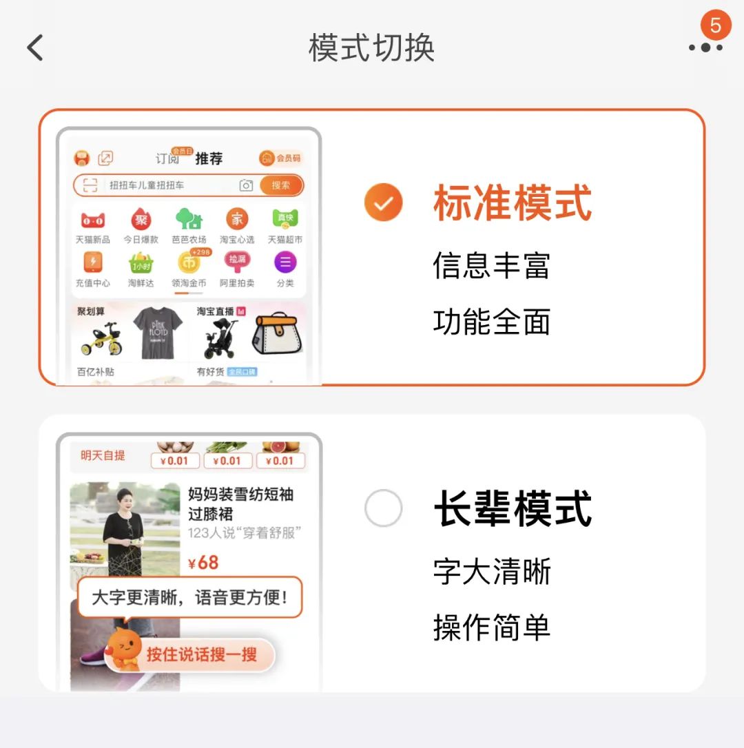 今日,淘宝推送最新版本 10.4.10 ,在双 11 前最新版本中正式上线“长辈模式”,方便长辈清晰无阻碍线上网购。此次长辈模式主要将页面更简单化、字体放大以及上线了智能语音助手,目的就是为了帮助银发族逛淘宝时看得更清楚,操作更简单,购物更便利。此外,开启长辈模式后,淘宝会推荐符合老年群体使用的商品,还在首页保留了“金币抵钱”、“领水果”、“天天特卖”、“消消乐”等 4 个最受银发人群喜爱的互动功能。