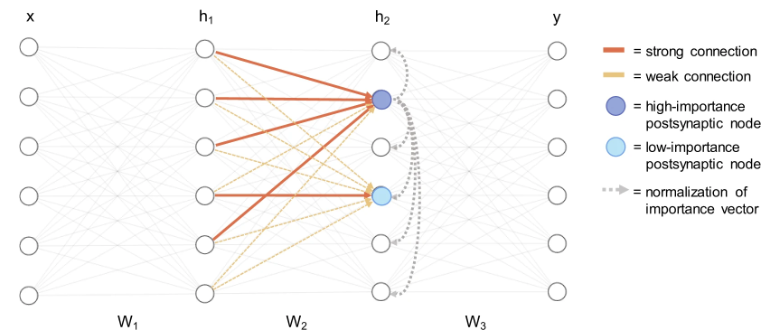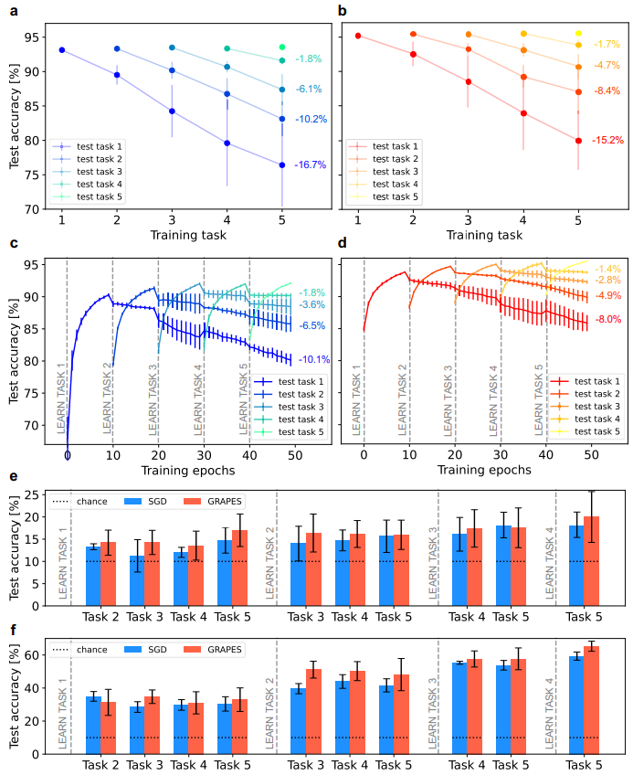 研究人员认为这些属性源于这样一个事实,即 GRAPES 有效地将与对当前输入的响应相关的误差信号信息以及网络内部状态的信息相结合,而与数据样本无关。事实上,GRAPES 丰富了基于输入驱动责任的突触更新,并通过依赖于网络驱动责任的调制来丰富突触更新,这表明节点对网络输出的潜在影响,独立于输入。这样的训练策略赋予了用 GRAPES 训练的网络在较少数量的 epoch 中实现收敛的能力,因为训练不限于仅取决于所提供的训练样本的信息。出于同样的原因,无论是在学习任务上进行测试,还是在持续学习场景中呈现未见过的任务时,这种网络都比 SGD 表现出更好的泛化能力。在这种情况下,研究人员确定了大脑中可塑性类型的并行性。响应神经元活动的突触强度变化是由两种形式的可塑性相互作用引起的:同突触和异突触。同突触可塑性发生在输入诱导期间活跃的突触处,因此是输入特定和关联的,作为输入驱动的责任。相反,异突触可塑性涉及不被突触前活动激活的突触,并作为在同突触变化后稳定网络的附加机制。因此,与网络驱动的责任类似,异突触可塑性并不表现出严格的输入特异性。该团队的算法似乎与现有的归一化方案和赢家通吃计算原语有一定的相似性。然而,由于 GRAPES 依赖于网络驱动责任的概念,它的主要计算是基于突触强度而不是突触活动。此外,以前的工作已经考虑到神经元传达突触强度的可能性。例如,2010 年 Ila R. Fiete 团队提出了异突触长期抑制的总权重限制规则:当进入(或离开)一个神经元的突触的总权重超过限制时,该神经元的所有传入(或传出)突触都会被削弱。这种机制意味着突触将有关突触权重值的信息传递给突触后节点,并且此类信息用于以非局部方式调节突触权重。第二个例子是 Kenneth D. Harris 和 Sarah N. Lewis 提出的轴突信号和神经市场理论。实验证据表明,神经元能够通过称为神经营养因子的分子携带轴突后信号,这些分子可以编码突触强度及其时间导数的信息。这些信息用于促进或阻碍突触权重变化的巩固。神经市场理论建立在轴突信号机制的基础上,并提出了大脑中神经元网络如何自组织成功能网络的模型。神经市场理论和 GRAPES 算法都依赖于关于权重及其变化的信息的传播,因此这两个框架存在一些类比。首先,轴突后信号通过调节突触更新来控制突触的可塑性。类似地,GRAPES 中使用重要性向量来调节 BP 规定的权重变化。其次,携带体重强度和体重变化信息的轴突后信号传播缓慢;同样,GRAPES 中的信息仅在每批之后应用。第三,通过神经营养因子传播的信息和 GRAPES 中的重要性都不依赖于梯度。最后,Sarah N. Lewis 的理论引入了细胞价值的概念,它衡量了细胞输出的有用性,并被定义为如果细胞死亡,网络性能的恶化。如果一个细胞的所有传入连接都为零,则该细胞被灭活,因此一个细胞的价值与该细胞的传入突触的强度有关。因此,value 可以与 GRAPES 中节点重要性的概念相关。总之,GRAPES 的基本思想受到节点重要性、误差调制和重量强度通信的概念的启发,这些概念得到了研究树突整合、突触缩放和轴突后信号作用的实验的支持。虽然生物学灵感基于这些机制,但只有类似 GRAPES 的可塑性调制的高级概念与神经回路中观察到的可塑性调制原理兼容。GRAPES 的好处源于对误差信号的调整。调制因子的非均匀分布,加上向上游层的传播,使得 GRAPES 在训练期间能够极大地增强突触更新的子集。因此,与 SGD 相比,小群突触能够在更大程度上增强或减弱。从初步调查来看,GRAPES 似乎将网络权重传递给更具生物学合理性的分布,特别是重尾分布。IBM 研究院的研究人员认为 GRAPES 所展示的特性可能源于这种重量分布。该团队正在进行的工作目前正在寻求对这一现象的更全面的了解。值得注意的是,他们的结果表明,GRAPES 提供了一种有前途的策略,可以减轻由硬件相关约束(例如噪声和精度降低)引起的性能下降。这些约束在许多方面反映了生物电路,因为突触传递受噪声影响并且神经信号被量化。有趣的是,GRAPES 保留了与生物过程的许多相似之处。因此,该团队认为 GRAPES 的生物学机制可能在克服与硬件相关限制相关的限制方面发挥核心作用。此外,他们认为这种受大脑启发的特征是 GRAPES 对生物启发模型的好处的根源。已经证明,GRAPES 不仅改进了标准 ANN 的基于 BP 的训练,而且还显着提高了使用生物学上合理的信用分配策略(例如 FA 和 DFA)训练的网络以及依赖于尖峰神经元动态的网络的性能。