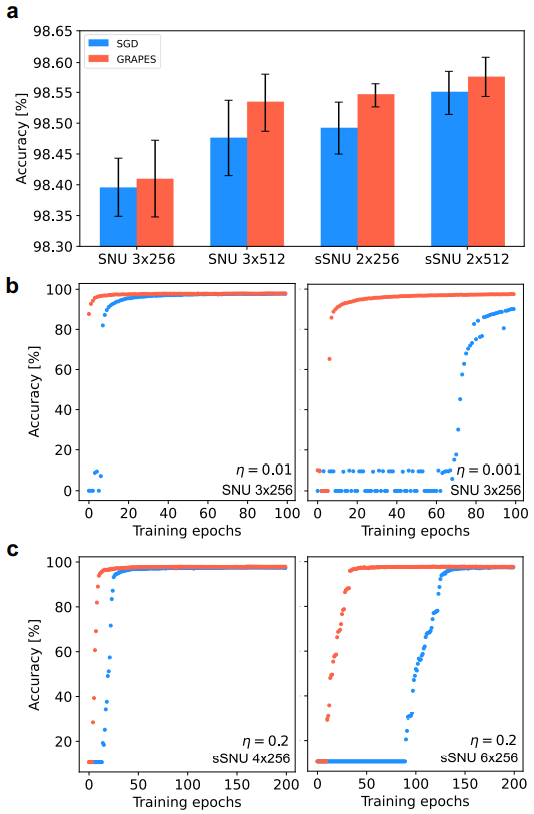 FA 算法和 SNN 模型都是弥合生物学合理性和机器学习的关键步骤。然而,在现阶段,与使用 BP 训练的 ANN 相比,它们只能取得有限的性能。例如,如结果部分所示,与 BP 相比,FA 和 SNNs 方法的准确性和收敛速度都较低,并且 SNNs 训练受到网络复杂性和超参数变化的严重影响。由于对误差信号的有效调制增强了最重要参数的更新,GRAPES 减少了此类限制的影响,从而缩小了仿生算法与标准 ANN 性能之间的差距。总而言之,该团队的研究结果表明,在神经网络优化中结合 GRAPES 和更普遍的受大脑启发的局部因素,为生物启发学习算法的性能和新型神经形态计算技术的设计的关键进展,铺平了道路。数据地址:https://github.com/IBM/GRAPES论文链接:https://www.nature.com/articles/s41467-022-29491-2