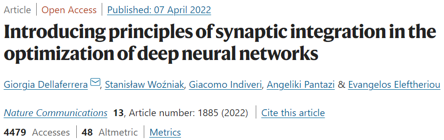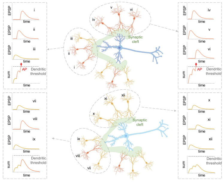 编辑 | 萝卜皮众所周知,大脑中的可塑性回路通过突触整合和突触强度的局部调节机制受到突触权重分布的影响。然而,迄今为止设计的大多数人工神经网络训练算法都忽略了刺激依赖性可塑性与局部学习信号的复杂相互作用。在这里,IBM 研究院的研究人员,提出了一种新的受生物学启发的人工和尖峰神经网络优化器,该优化器结合了在皮质树突中观察到的突触可塑性的关键原则:GRAPES(Group Responsibility for Adjusting the Propagation of Error Signals)。GRAPES 在网络的每个节点上实现了与权重分布相关的误差信号调制。研究表明,这种受生物学启发的机制可以显着提高具有前馈、卷积和循环架构的人工和尖峰网络的性能,它可以减轻灾难性遗忘,并且最适合专用硬件实现。总而言之,将神经生理学见解与机器智能相协调是提高神经网络性能的关键。该研究以「Introducing principles of synaptic integration in the optimization of deep neural networks」为题,于 2022 年 4 月 7 日发布在《Nature Communications》。人工神经网络 (ANN) 在 1940 年代首次提出,作为哺乳动物大脑神经回路的简化计算模型。随着计算能力的进步,人工神经网络偏离了它们最初受到启发的神经生物学系统,并重新定位于目前广泛应用中使用的计算技术的发展。在提出的用于训练多层神经网络的各种技术中,反向传播 (BP) 算法已被证明是一种有效的训练方案。尽管机器智能取得了令人瞩目的进步,但人工神经网络的潜力与大脑计算能力之间的差距仍有待缩小。人工神经网络的基本问题,如训练时间长、灾难性遗忘和无法利用日益增加的网络复杂性,不仅需要处理人类大脑的能力,还需要提高日常使用设备的性能。例如,减少机器人应用程序中在线学习的训练时间对于确保机器人代理快速适应新环境并降低与训练相关的能源成本至关重要。已经提出了几种技术,例如批量归一化、层归一化和权重归一化,以加速 ANN 的训练。这些方法虽然成功地提高了收敛速度,但距离生物大脑的学习能力还差得很远。与哺乳动物的神经回路相比,人工神经网络在大脑方面的局限性很大程度上归因于其结构和动力学的大幅简化。对大脑功能至关重要的几种机制,包括突触整合和体重强度的局部调节,通常不在基于 BP 的人工神经网络训练中建模。克服这一限制可能是使人工网络的性能更接近动物智能的关键。突触整合是神经元在产生动作电位 (AP) 之前结合数千个突触前神经元接收到的尖峰序列的过程。轴突 AP 在细胞的轴突中被引出,作为对从细胞树突接收到的输入的响应,并充当神经元的整体输出信号。实验证据表明,至少在 CA1 细胞中,由于树突的活跃特性,来自不同突触前神经元的输入信号到达同一突触后细胞可能与非线性动力学相互作用。具体而言,当在树突分支中发生强去极化时,在该区域中引发树突AP。树突状 AP 会提高产生它的兴奋性突触后电位(EPSP)总和的幅度,从而在树突状输入到达胞体之前放大树突状输入以引发轴突 AP。树突尖峰的产生需要空间上连接到同一分支的足够多的突触前细胞在时间上以足够的突触强度活跃。因此,突触输入影响突触后神经元输出的能力取决于它们在树突树中的位置。神经元强大的计算能力被认为源于源自树突尖峰的复杂非线性动力学。下图表明了这种机制,并显示了每个突触前神经元的影响如何还取决于通过其他突触前连接传递到同一突触后神经元的信号。因此,局部权重分布可以负责提升特定节点的输入信号。与大脑中的神经元类似,ANN 中的节点接收来自许多细胞的输入并产生单个输出。研究人员可以将人工节点的激活与轴突 AP 联系起来,但树突 AP 的机制并没有严格地转化为点神经元的动力学。然而,树突尖峰受到树突分支内突触强度分布的强烈影响。类似地,人工节点的非线性动力学受到进入一层节点的突触权重分布的影响。令人惊讶的是,在人工神经网络的常见训练方法中,缺乏考虑每个节点权重分布的机制。