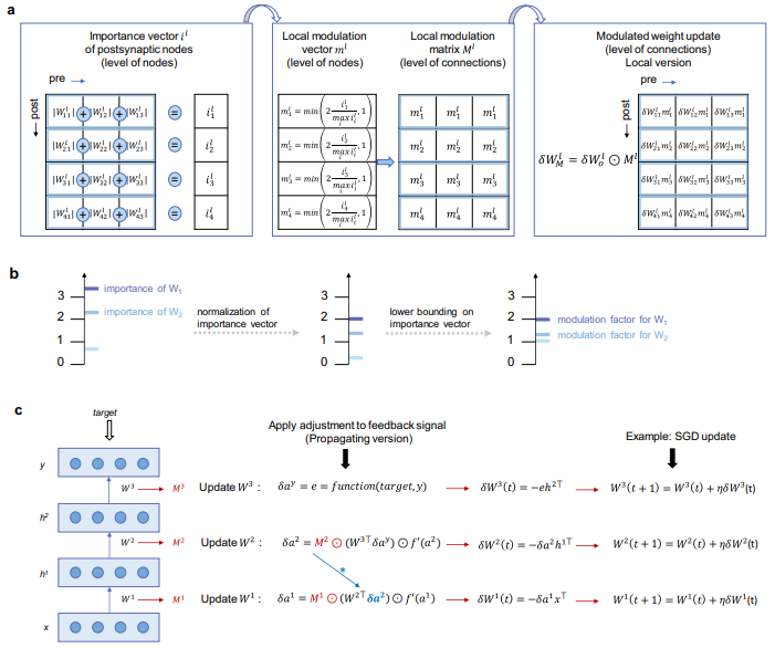 图示:生物和人工网络中的突触强度分布。(来源:论文)此外,大脑中的突触可塑性主要由局部信号驱动,例如邻近神经元的活动。突触之间的局部相互作用在调节学习过程中的体重变化中起着至关重要的作用。在这种情况下,异突触竞争机制允许通过限制连接到相同突触前或突触后神经元的突触的总强度来调节突触生长。这种现象发生在每个神经元的突触之间的非线性竞争。受非线性突触整合和局部突触强度调节的生物学机制的启发,IBM 研究院和苏黎世大学的研究人员提出了 GRAPES(调整错误信号传播的组责任),这是一种用于 ANN 和 SNN 训练的新型优化器。GRAPES 依赖于节点重要性的新概念,该概念将网络中每个节点的责任量化为层内局部权重分布的函数。图示:调制因子的计算。(来源:论文)应用于基于梯度的优化算法,GRAPES 提供了一种简单有效的策略来动态调整每个节点的误差信号并增强最相关参数的更新。与动量等优化器相比,该方法不需要存储先前步骤的参数,避免了额外的内存损失。这个特性使得 GRAPES 在生物学上比基于动量的优化器更合理,因为神经回路不能保留来自先前状态的大部分信息。研究人员在五个静态数据集(MNIST、CIFAR-10、CIFAR-100、Fashion MNIST 和 Extended MNIST)上使用 ANN 以及在时间速率编码的 MNIST 上使用 SNN 验证了该方法。他们成功地将 GRAPES 应用于监督学习的不同训练方法,即 BP、FA 和 DFA,以及不同的优化器,即 SGD、RMSprop 和 NAG。研究人员证明了所提出的基于权重的调制可以在 ANN 和 SNN 中带来更高的分类精度和更快的收敛速度。之后,他们展示了 GRAPES 解决了 ANN 的主要限制,包括缓解性能饱和以增加网络复杂性和灾难性遗忘。