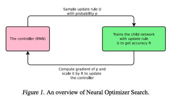 而 Google Brain 在 ICML 2017 的论文《Neural Optimizer Search with Reinforcement Learning》中,就讲到了一种学习优化更新规则的技术。神经优化器搜索如下图所示: