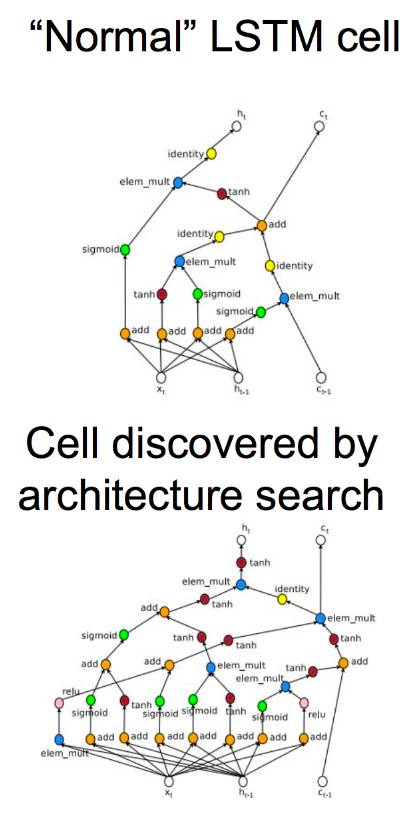 上图是正常的 LSTM 单元与架构搜索所发现的单元图。