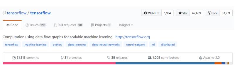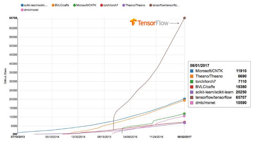 下面是 TensorFlow 项目近年来在 Github 上的关注度,我们可以看到 TensorFlow 是所有同类深度学习框架中关注度最大的项目。