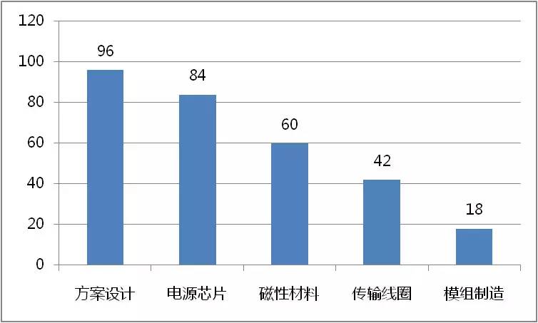虽然无线充电技术是以不同终端产品的形态展现在消费者面前,但其实无线充电功能的实现包含多个技术点,即其产业链包含多个环节。大致来讲,无线充电产业链从上游到下游,包括以下五个环节:电源芯片、磁性材料、传输线圈、模组制造、方案设计。其中方案设计和电源芯片环节技术壁垒高、利润高(大概各占无线充电产业链利润的30%),基本被国外企业垄断。磁性材料和传输线圈环节技术壁垒相对较低,同时拥有中外玩家,利润占比各为20%和14%。模组制造环节技术壁垒和利润最低,主要参与者为国内厂商,厂商利润占比仅为6%。