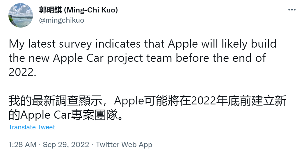 刚刚,堪称苹果「首席爆料人」的郭明錤发推表示,根据他的最新调查,苹果「很可能」重建Apple Car团队,时间大概率就在今年年底前。