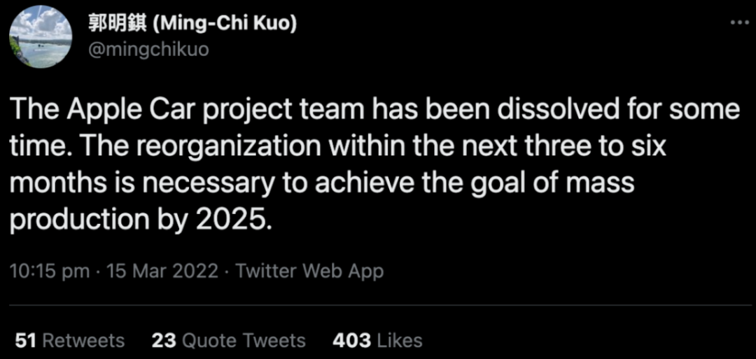 说来也巧,大概半年前,还是这个郭明錤,也是在推特上爆料说,苹果「泰坦」造车团队已经解散有些日子了。