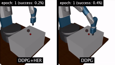 HER算法做了人类直觉的做法:即使我们没有达到特定的目标,我们假装已经达到了冰球的目标。通过这样做,强化学习算法获得一些学习信号,因为他已经实现了某些目标。