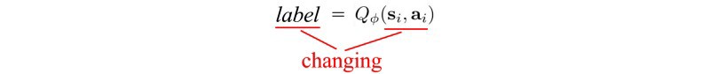 DQN对于Q-learning非常中啊哟,它通过使用深度神经网络来拟合Q。在强化学习中,随着机器探索更多它会搜索得更好,但这很糟糕,因为输入空间和动作不断变化,这也是我们更新Q的目标值的方式。