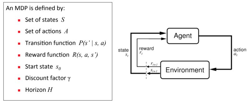 对于强化学习,我们使用一个成为马尔可夫决策过程(MDP)的框架,它为非常复杂的问题提供了一个简单的框架。代理(例如机器人手臂)将首先观察其所处的环境并采取相应的行动。根据结果给出奖励。