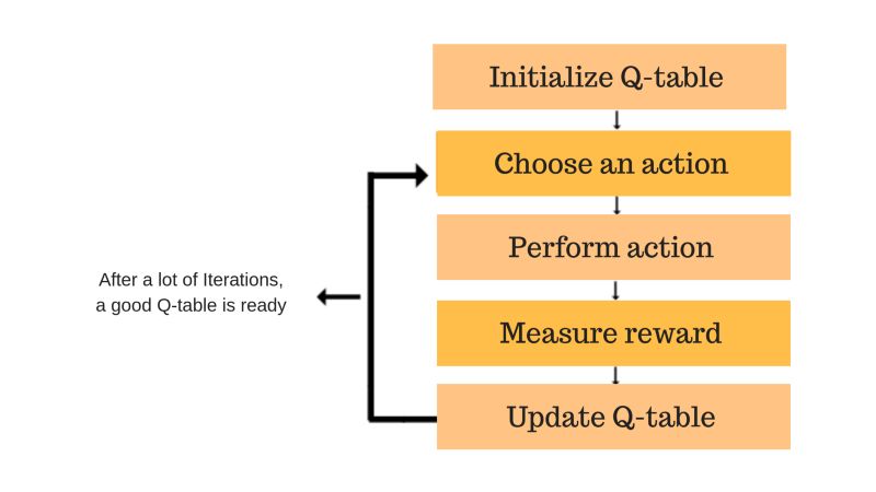 大多数情况下,我们只是一次又一次地重复这个操作,直到机器人学会了并且Q表将被更新。这些是我们所做的所有步骤: