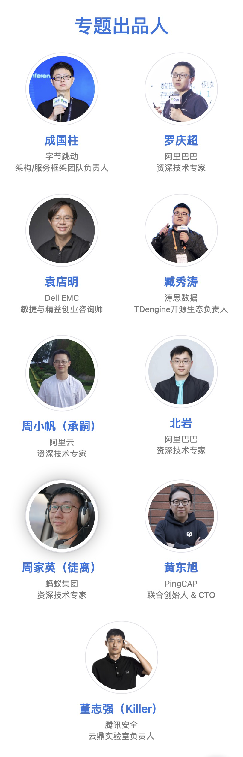 目前,我们已经邀请到了来自阿里巴巴、蚂蚁集团、腾讯、字节跳动、PingCAP、涛思数据等公司的资深技术专家担任专题出品人,精彩议题正在打磨评估中……