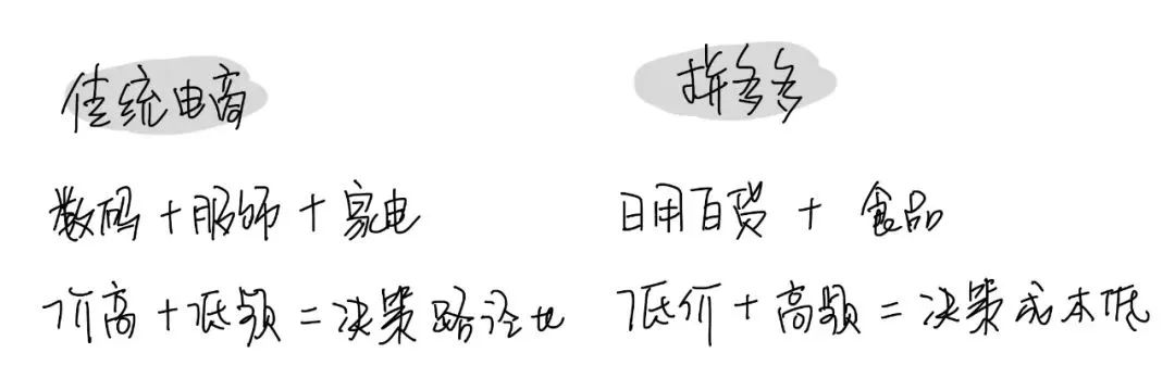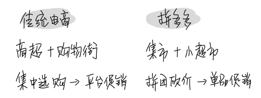 淘宝刚开始切的是购物街、商场的市场,拼多多则是把百姓平时在家门口小超市购买的日常生活用品放到线上来解决了。