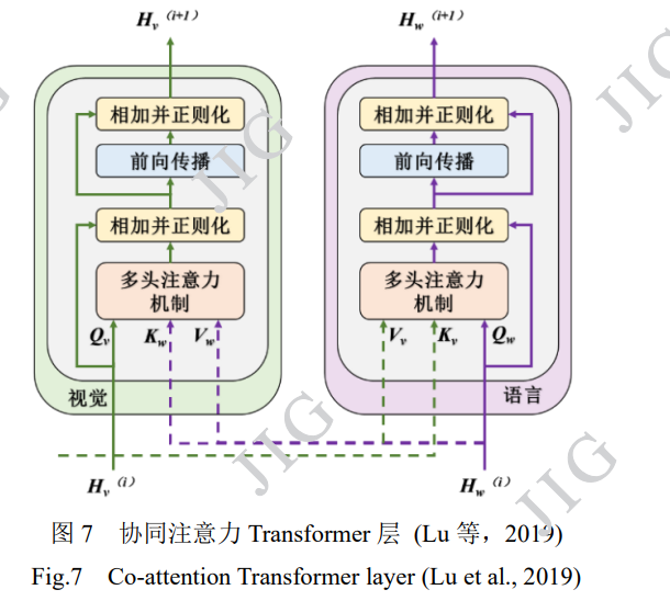 由于图像和文本信息在属性上区别较大,将不 同模态输入置于相同输入地位可能对模态间匹配造 成不良影响。在这一假设下,部分模型根据多模态 输入特点设计双流预训练模型,使用不同编码器灵 活处理各自模态特征,并通过后期融合对不同模态 进行关联。