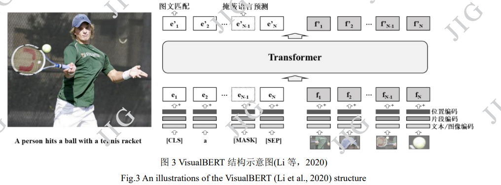 深度学习(deep learning, DL)方法在计算机视 觉(computer vision, CV)、自然语言处理(nature language processing, NLP)以及多模态机器学习(multimodal machine learning, MMML)的各个具体任务 上取得了令人瞩目的进展,但不同任务之间需要使 用专有的数据进行训练,大量的重新训练使得时间 和经济成本显著增加。预训练模型(pre-trained model, PTM)与微调(fine-tuning)相结合的范式旨在缓解 这一困难,预训练模型首先在大规模通用数据集上 利用自监督为代表的方式进行预训练,使得模型在 迁移至下游任务之前学习到通用的表征,然后在小 型专有数据集中进行微调得以获取特定任务知识 (Yosinski 等,2014)。这一方法在很大程度上打破 了各具体任务之间的壁垒,在避免重新训练所造成 的资源浪费的同时,对下游任务的性能起到促进作 用。Transformer(Vaswani 等,2017)是当前预训练 模型最为广泛使用的基础结构,其因为在处理长距 离依赖关系方面的优势,最初在机器翻译方面取得 了成功,随后广泛用于 NLP 领域。GPT(Radford 等, 2018)采用 Transformer 作为模型预训练的基础结构 在大规模语料库中进行预训练,将学习到语言知识 的参数模型用于具体任务,实验中 12 个下游的 NLP 任务性能取得了显著的提升。BERT(Devlin 等,2019) 采用了双向语言模型进行预训练,在语料中随机对 15%的单词令牌(token)进行掩码,要求模型可以 预测出原有单词令牌,此外还进行了句子预测任务, 实验中 11 个下游的 NLP 任务性能取得了提升。随 后的若干工作(Dong 等,2019;Liu 等,2019a;Radford 等,2019;Shoeybi 等,2019;Zellers 等, 2019;Yang 等,2019;Brown 等,2020;Lewis 等, 2020;Raffel 等,2020;Zhang 等,2020b,2021b;Fedus 等,2021;Sun 等,2021;琚生根 等,2022;强继朋 等,2022)证明预训练的语言模型能够普适 地对下游任务性能起到促进作用。受到 NLP 领域的 启发,CV 方面的研究者也相继开展基于Transformer 的视觉预训练工作。ViT(Dosovitskiy 等,2021)将图像的补丁块(patch)作为序列输入 Transformer 进 行预训练,克服 Transformer 结构难以处理图像输入 这一困难。CLIP(Radford 等,2021)将自然语言作 为监督以提升图像分类效果,使用对比学习 (contrastive learning, CL)方法促进图像和文本的匹 配能力。MAE(He 等,2021a)将 NLP 中常用的自 监督方法用于 CV 预训练,其通过训练自编码器, 预测经过随即掩码而缺失的图像 patch,从而高效、 准确地进行图像分类任务。