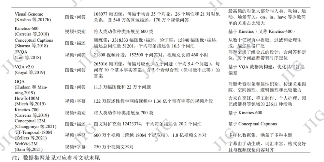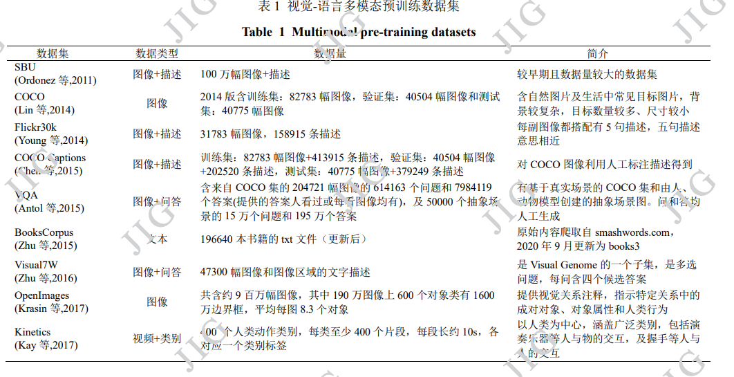 在各类预训练任务中,模型性能受预训练数据 集质量的影响显著。为了获取通用的多模态知识, 视觉-语言预训练任务主要使用带有弱标签的视觉语言对进行模型训练。图像-文本任务主要为图像及 标题、内容描述、人物的动作描述等。类似地,视频 -语言预训练数据集包含大量的视频-文本对,其标签 来源包括视频中的文字描述以及由自动语音识别 (automatic speech recognition, ASR)技术获得的文 本信息等。部分模型为针对性提升某一模态的表征 提取能力,在多模态预训练之外还进行单模态数据 集进行预训练,使用如图片数据集与纯文本数据集。 预训练中常用的公开数据集有,图文数据集 SBU(Ordonez 等,2011),Flickr30k(Young 等, 2014),COCO Captions(Chen 等,2015),Visual Genome(VG)(Krishna 等,2017b),Conceptual Captions (CC, CC3M)(Sharma 等,2018)和 Conceptual 12M (CC12M)(Changpinyo 等,2021),VQA(Antol 等, 2015),VQA v2.0(Goyal 等,2019),Visual7W(Zhu 等,2016),GQA(Hudson 和 Manning,2019)。视 频数据集 TVQA(Lei 等,2018),HowTo100M(Miech 等,2019),Kinetics(Kay 等,2017),Kinetics-600 (Carreira 等,2018),Kinetics-700(Carreira 等, 2019),YT-Temporal-180M(Zellers 等,2021),WebVid-2M(Bain 等,2021)。单模态图片数据集 COCO (Lin 等,2014),OpenImages(Krasin 等,2017), 文本数据集 BooksCorpus(Zhu 等,2015)以及 English Wikipedia。数据集信息汇总如表 1 所示,以下对代 表性的数据集做进一步介绍。