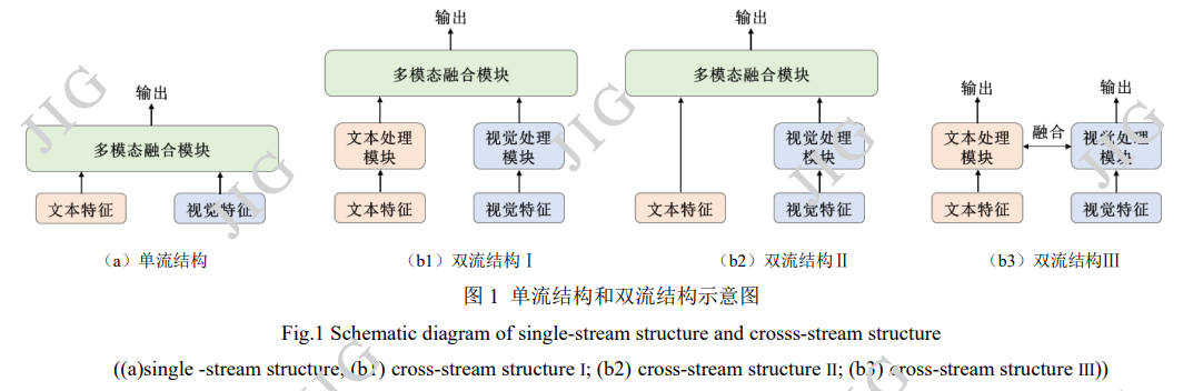 单流模型将视觉特征和语言特征直接输入融合 模块,进行模型训练,其典型方式如图 1(a)所示。双流模型将视觉特征和语言特征分别进行处理,然 后进行模态间的融合,典型类型包括但不限于图中三类,图 1(b1)中,模型首先对两路特征分别进行 处理,然后进行跨模态融合;如图 1(b2)中,视觉 特征经过视觉处理模块后,与文本特征一同送入多 模态融合模块进行交互;图 1(b3)中,两路特征送 入各自处理模块后进行交互式的参数训练。