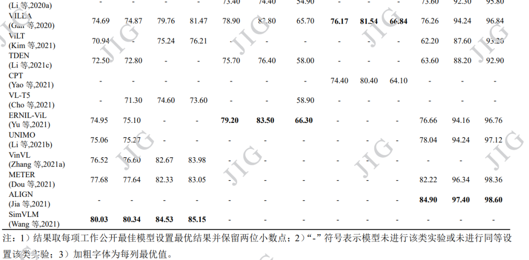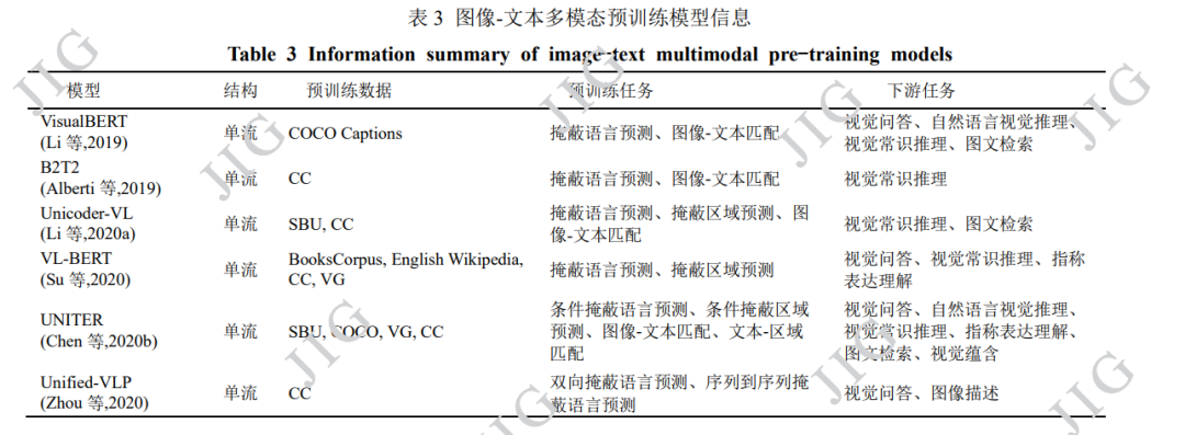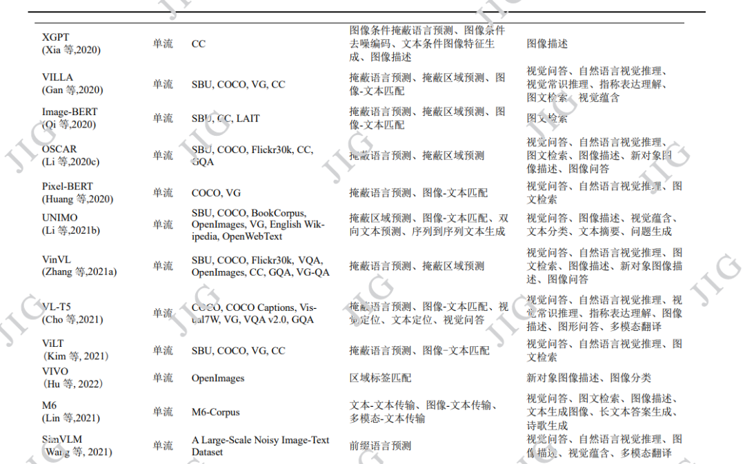 图像-文本多模态下游任务繁多,代表性的任务 有分类任务如视觉问答(Johnson 等,2017;Hudson 和 Manning,2019)),自然语言视觉推理(natural language visual reasoning, NLVR)(Suhr 等,2017, 2018),视觉常识推理(Gao 等,2019);指称表达理解(referring expression comprehension, REC)(Yu 等, 2016b;Mao 等,2016),视觉蕴含(visual entailment, VE)(Xie 等,2018a,2019)等,检索任务如图文检 索(image-text retrieval)(Karpathy 和 Li,2015; Plummer 等,2015;Lee 等,2018);生成任务如图 像描述(Vinyals 等,2015;Xu 等,2015;Anderson 等,2018),新对象图像描述(novel object captioning, NoCaps )( Agrawal 等 , 2019 ) 及 多 模 态 翻 译 (multimodal translation)(Elliott 等,2016)。如下对 表 5 中 VLP 模型所进行对比的下游任务与相关数据 集进行进一步介绍。
