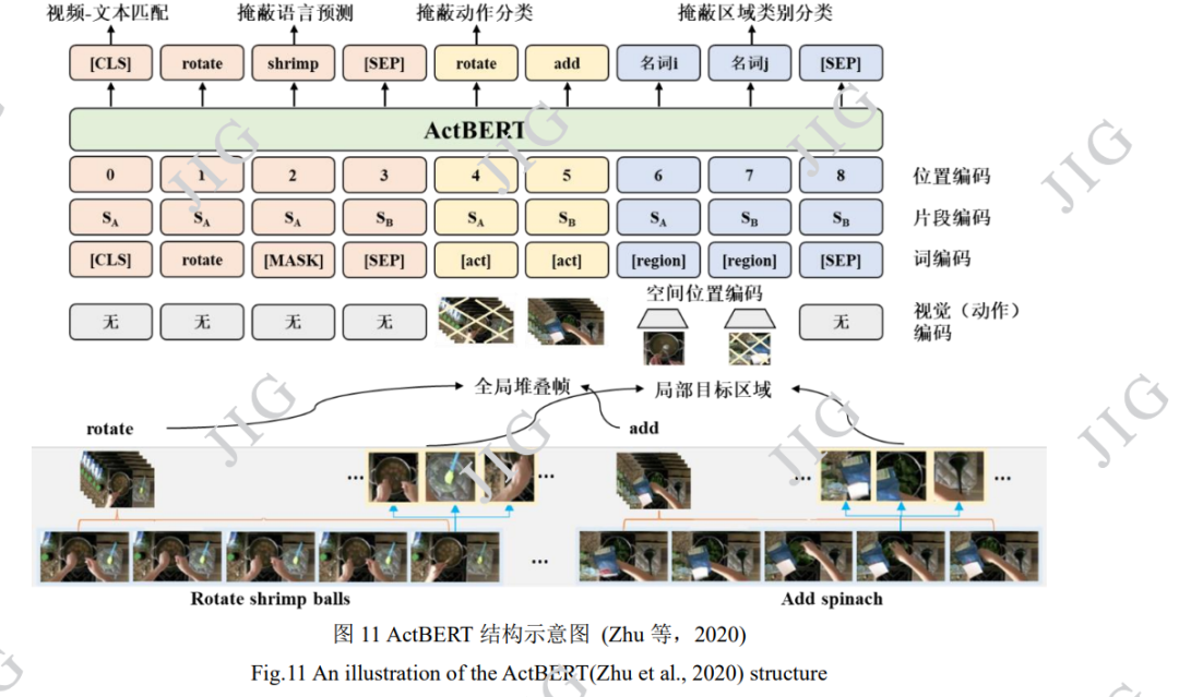 Zhu 等(2020)提出了全局局部动作 VLP 模型 ActBERT,结构如图 11 所示,对于视频输入采取两 种编码处理。首先是动作编码,加入全局堆叠帧获 取全局动作信息,动作信息来自每个视频相应描述 中提取动词所构建的字典,为简化问题删除了没有 任何动词的视频片段。然后是视觉编码,加入经 Faster-RCNN 对图像提取的 RoI 特征获取局部区域 信息。ActBERT 利用全局动作信息来促进文本与局 部目标区域间的交互,使一个视觉中心能同时描述 局部和全局视觉内容,提升视频和文本的关联性。 引入了掩蔽动作分类(mask action classification, MAC),即随机掩蔽输入的动作表示向量,使模型通 过其他信息如文本信息和物体信息来预测出动作标 签。模型在 5 类下游任务上表现良好。