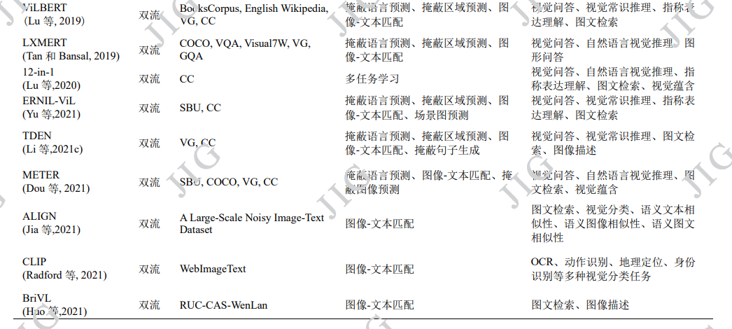 当前对预训练模型的综述工作主要集中在单模态(Qiu 等,2020;Kalyan 等,2021;Min 等,2021;陈德光 等,2021;韩毅 等,2022),部分工作梳理 视频-文本多模态类型(Ruan 和 Jin,2021),但较为 全面的 VLP 综述工作(Chen 等,2022)相对较少。本文梳理最新视觉语言多模态预训练模型的相关研 究成果,首先对 VLP 模型常用的预训练数据集和预 训练方法进行了简单介绍,然后在介绍基础结构之 后对 VLP 模型按视觉输入来源进一步分类, 介绍目 前具有代表性的图像-文本预训练模型和视频-文本 预训练模型,并根据模型结构不同分为了单流和双 流类型,重点阐述各研究特点,对不同 VLP 预训练 模型在主要下游任务上的性能表现也进行了汇总。最后对目前研究面临的问题进行探讨。