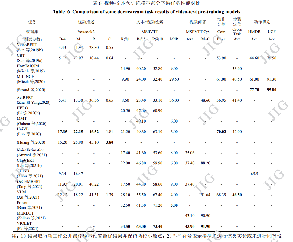 关于视频的视觉-语言交叉任务同样覆盖广泛, 代表性的任务有视频描述(Gan 等,2017;Krishna 等,2017a);文本-视频检索(Gao 等,2017;Hendricks 等,2017;Mithun 等,2018;Lei 等,2020b);视频 问答(video question answering)(Yu 等,2018;Lei 等,2020a);动作分割(action segmentation)(Tang 等,2019);步骤定位(action step localization) (Zhukov 等,2019);动作识别(Kuehne 等,2011; Soomro 等,2012);视频摘要(video summarization) (Plummer 等,2017);视觉故事讲述(visual storytelling)(Agrawal 等,2016 ;Huang 等,2016)。 如下对表 6 中 VLP 模型所进行对比的下游任务与相 关数据集进行进一步介绍