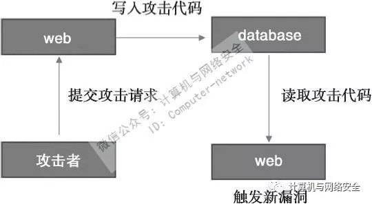 需要先构造好利用代码写入网站保存,在第二次或多次请求后调用攻击代码触发或者修改配置触发的漏洞叫做二次漏洞,举一个简单的SQL注入例子,攻击者A在网站评论的地方发表了带有注入语句的评论,这时候注入语句已经被完整地保存到数据库中,但是评论引用功能存在一个SQL注入漏洞,于是攻击者在评论处引用刚提交的带有注入语句的评论,提交后server端从数据库中取出第一次的评论,由于第一次评论中带有单引号可闭合第二次的语句,从而触发了注入漏洞。
