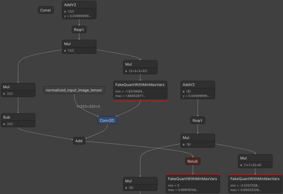 下图表示的是 uint8 EdgeTPU 模型计算图的一部分。以红色突出显示的节点是由 QAT 机制插入的。在 uint8 DSP 模型计算图中,您也会看到相同种类的节点。