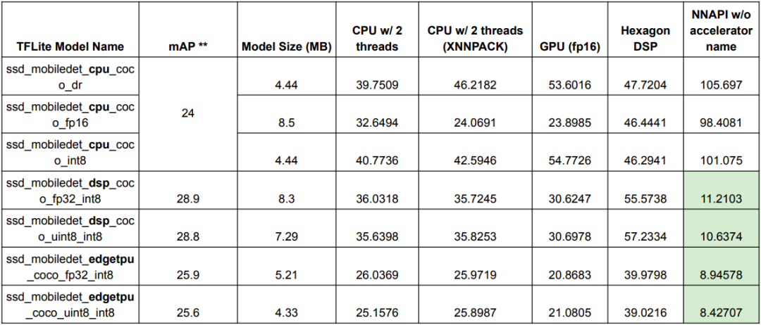 重要说明:MobileDet 的 EdgeTPU 和 DSP 变体需要在各自对应的硬件加速器上运行。这些加速器需要具有全整数精度的模型。因此,利用动态范围和 float16 量化转换 EdgeTPU 和 DSP 变体并没有任何实际用途。
