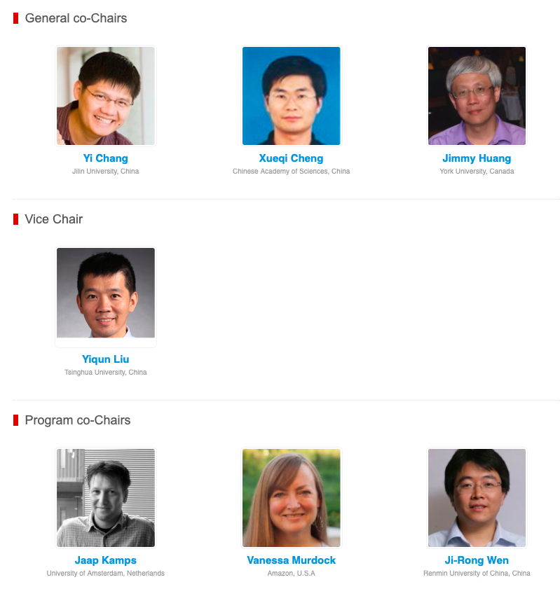 据了解,本届大会共同主席有三位,分别为吉林大学人工智能学院院长常毅,中科院计算所程学旗和约克大学Jimmy Huang。副主席为清华大学刘奕群。而程序委员会主席有人大高瓴智能研究院院长文继荣,荷兰阿姆斯特丹大学Jaap Kamps,美国亚马逊Vanessa Murdock。