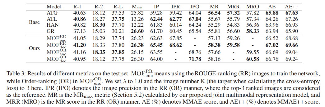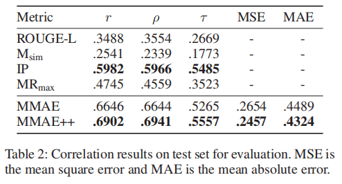 目前多模态自动文摘的数据集还比较匮乏,这项工作在MSMO数据集上进行实验验证。一般图文式摘要的评价关注三个方面的指标:图片准确率(IP)、文本摘要的ROUGE值(ROUGE-L)以及系统输出中图片文本的相关度(Msim)。该论文引入一个新的自动评价指标MRmax用来直接度量两个多模态信息之间的相似度(输出和参考答案的最大相似度)。MMAE是对IP、ROUGE和Msim的组合,MMAE++是IP、ROUGE、Msim和MRmax四个自动评价指标的组合。利用与人工打分之间的相关度来对比不同的自动评价指标。