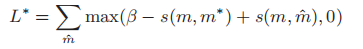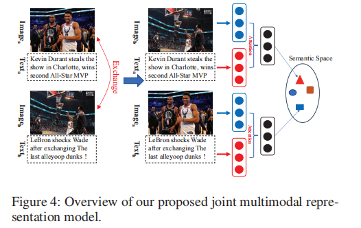 在跨模式检索中,输入是一对图像和一个文本。但是在该论文提出的模型中,输入变成一对多模态分段(ma,mb),其中ma =(Imagea,Texta)和mb =(Imageb,Textb)。关键问题是如何构建训练数据。MSMO数据集中有很多图像字幕对,并且假定每个图像都与相应的字幕相匹配。因此,通过交换两个图像标题对的图像(或文本)以获得匹配的多模态分段对(ma*,m*b),其中m*a =(Imageb,Texta)和m*b =(Imagea ,Textb)。值得注意的是,由于m*b中的Imagea与m*a中的Texta相匹配,而m*a中的Imageb与m*b中的Textb相匹配,因此m*a在语义上与m*b相匹配对图像和文本进行编码,然后使用多模式注意力机制融合文本向量和图像特征。最后模型是在一个新的最大利润率损失下训练的: