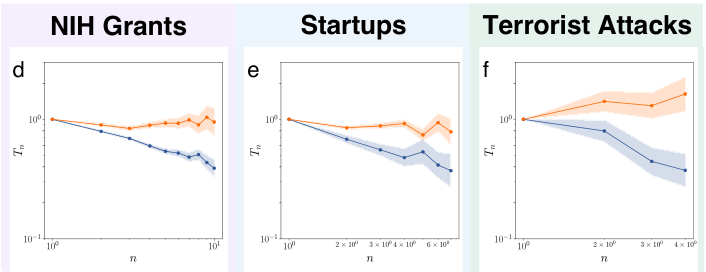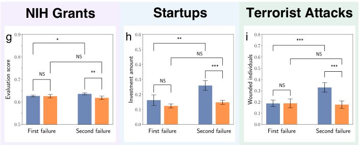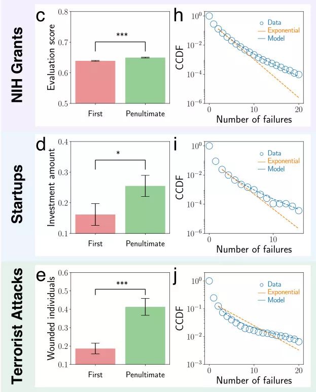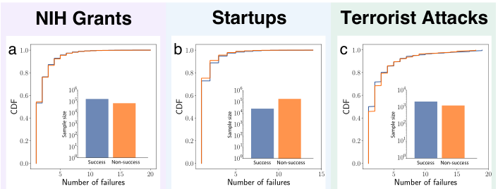 NIH Grants、Startups、Terrorist Attacks三个数据集真实案例所反映出的表现结果与失败曲线