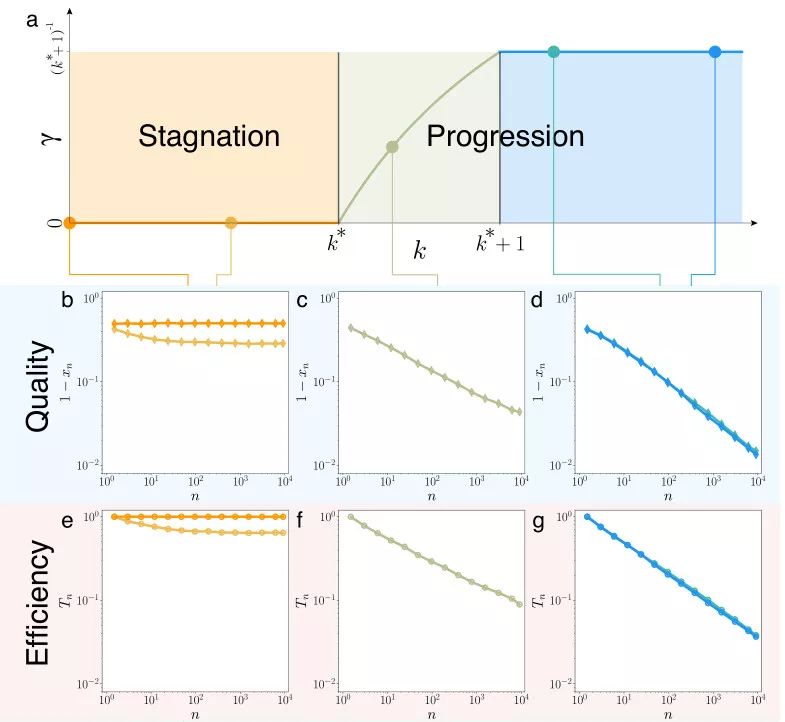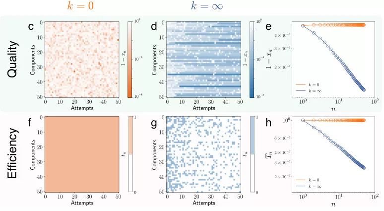 同时,研究者也评估了两件指标,每次尝试的质量和效率。在 k=0 这样的运气模型中,反复尝试并不能带来总体质量和效率上的提高改进(图 c、f),最后的成功与否完全取决于撞大运。而在另一个模型中(图 d、g),因为有经验的积累,我们明显能够看到质量(评价分数 x,图中以 1-x 减小表示质量增高)与效率(T)的改进。