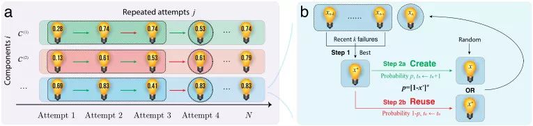 尝试、部件及其更迭模式,左图表示一个包含多个部件的事情,如何经过多次尝试之后,每个部件的分数均得到提升的过程;右图表示创造新部件还是沿用就部件的决策过程。