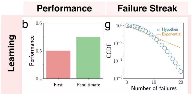 根据研究者的研究表明,学习的程度是存在阈值的——学习对失败的影响被限定在了一定的范围内。换而言之,随着 k 从 0 增大到 ∞,在相当长对的一段时间内,因为学习的经验太少(k太小),学习的质量和效率都很低,学了跟没学效果一样(图 a 中的橙色部分)。但是,超过了一定的范围,我们也会发现,失败的动力学特征和 k=∞ 时,基本相同。也表明,只要学习的内容涵盖了足够多的尝试经验,其结果跟学习过往所有的经验差不过。