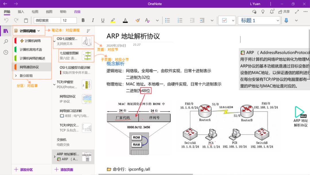 对电子笔记的执念产生于高中备考时期,那时我的纸质笔记很多,内容繁杂且查找不易,想着如果能用电子笔记管理该有多好。进入大学后,我开始尝试使用笔记软件来进行知识管理。印象笔记是我第一个接触到的笔记软件,因为不习惯其过少的层级管理而放弃使用。慢慢地我又接触到了为知笔记、有道云笔记等其他各种笔记软件,但它们都不适合课堂上灵活的记录形式,所以我又回到了纸质笔记。后来在准备 PAT 时,需要一个可以自由标注的笔记软件来记录题目与解题过程。在这种需求下我找到了 OneNote。通过详细的使用手册,我突然意识到这才是真正的「电子笔记本」,在课堂上的使用体验完全不同于其他软件,而是无限接近纸质笔记,单是灵活的文本框就让我难以忘记。通过后来的不断磨合,OneNote 成为我最常用使用的笔记软件。