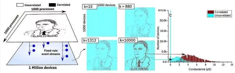 模拟数据:100 万个二进制(0 或 1)的随机进程,根据英国著名数学家艾伦·图灵的侧画像,构成了一个 1000x1000(像素)的黑白二维网格。IBM 研究人员设定所有像素点以同样的频率闪烁,但是在黑色像素点之间建立了微小的关联性——当一个黑色像素点闪烁时,另一个黑色像素点也会闪烁的可能性随之稍微提高。随机进程被一一对应分配给了 100 万个相变内存,并且在设备上运行了一个简单的学习算法。随着每次闪烁,相变内存数组会不断学习,同时对应进程的相变内存会转变成高电导状态。用这种方法,相变内存的电导图重新描绘了艾伦·图灵的侧画像。