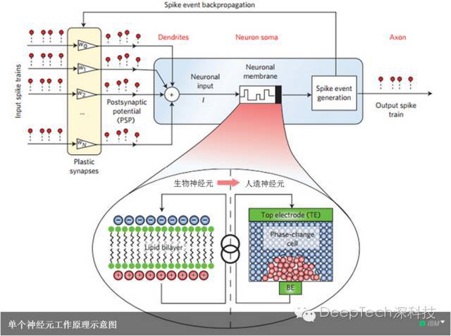 先回顾一下 IBM 于 2016 年 8 月发布的人造神经元。这种相变神经元由输入端(类似生物神经元的树突)、神经薄膜(类似生物神经元的双分子层)、信号发生器(类似生物神经元的神经细胞主体)和输出端(类似生物神经元的轴突)组成。信号发生器和输入端之间还有反馈回路以增强某些类型的输入信号。
