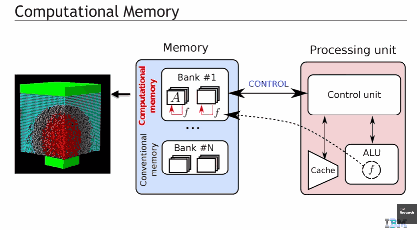 内存计算(In Memory Computing, IMC)或者说可计算储存,是近年来新兴的一个概念,其原理是运用内存设备的物理特性进行资料的储存和处理。不过 IBM 把这点做到更彻底,那就是不采用过去那种内建缓存,并通过总线连接外部内存的阶层式架构,而是省略总线设计,直接把内存和 CPU 核心做在一起,尽最大的可能消除计算过程中因数据迁移所造成的延迟。