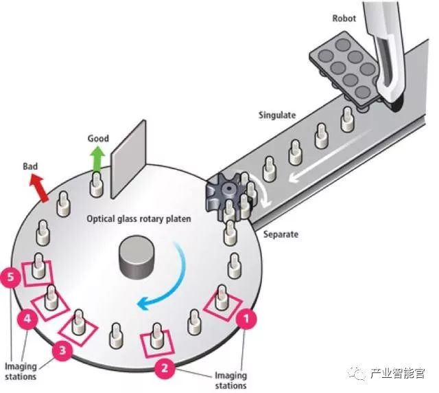 图3:星形轮将比色皿分开后,以相等的间隔将它们移动到600mm的旋转板上。该旋转板以每秒两个比色皿的速度,在5个成像站下传送它们。 当比色皿接近第一个成像站时,通过光电传感器触发一台Basler 1920×1200 ace相机,该相机配备Moritex的MML固定放大镜头。为了对比色皿的圆顶进行成像,将相机放置在旋转的玻璃压板下,并使用70mm×70mm的白光MDEL-CW70 LED平板灯(同样来自Moritex公司)从上方提供照明。然后,相机捕获的图像通过GigE接口传输到PCI Express多端口千兆以太网适配器,其安装在基于Intel i7的PC中。 为了处理这些图像以检测缺陷,Envisage Systems选择使用Teledyne DALSA公司的Sherlock机器视觉软件。