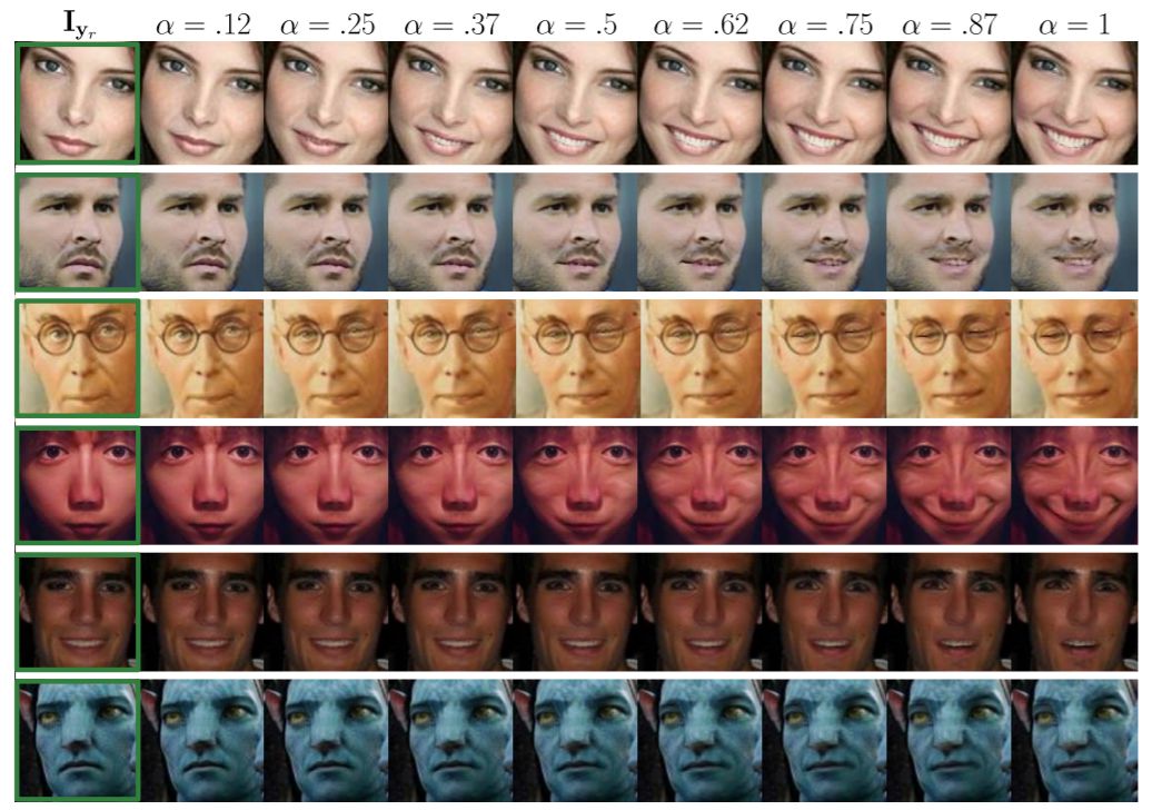 图 1:从单张图像生成的人脸动画。研究者提出了一种解剖结构上连贯的方法,该方法不局限于离散数量的表情,可以对给定的图像进行动画化处理, 并在一些连续的图像域中生成新的表情。在这些例子中,只给出最左边的图像输入 I_yr(由绿色方框圈出), 参数α控制微笑表情中包含的目标动作单元的激活程度。此外, 该系统可以处理非自然光照条件下的图像, 如最下面一行的例子。