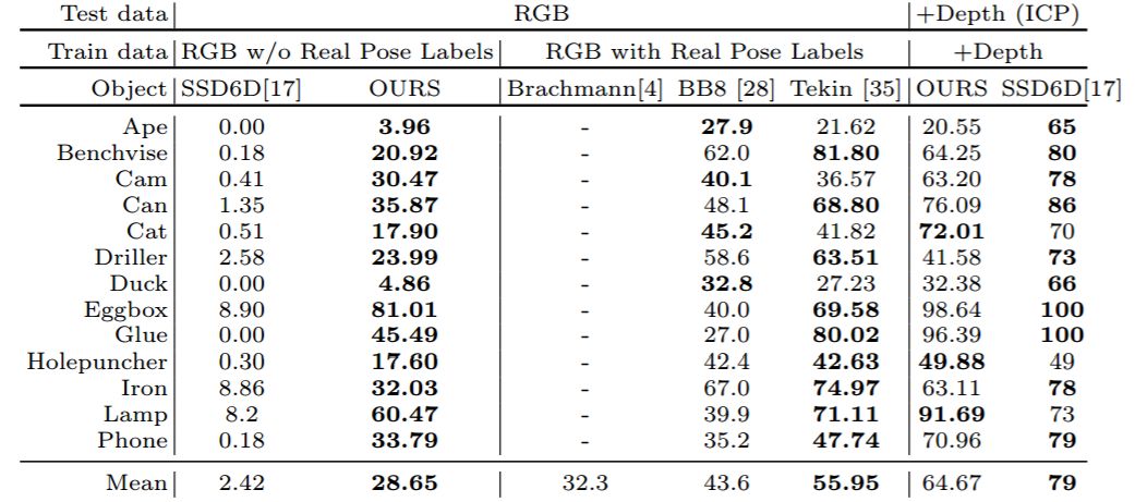 表 5:LineMOD:使用不同训练和测试数据的目标召回(ADD 标准),结果来自 [35]。