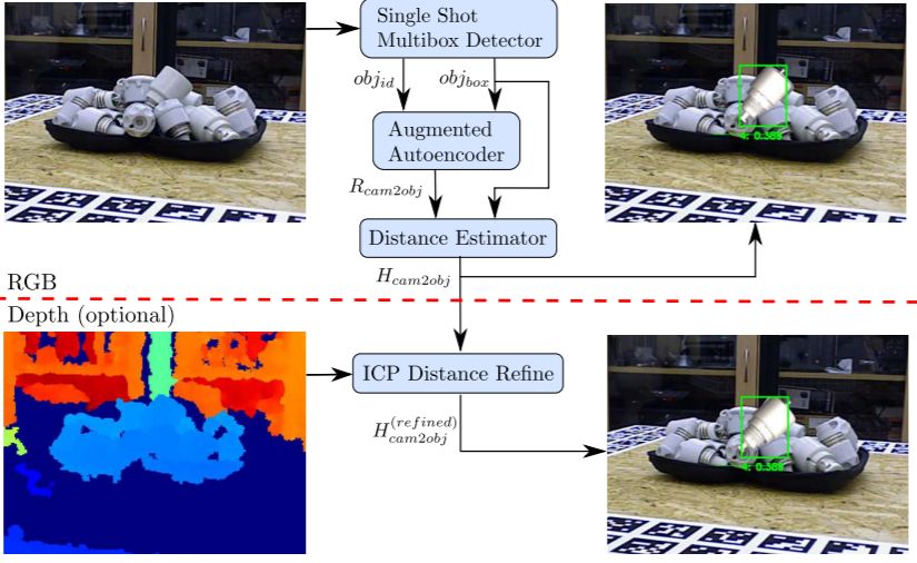 图 1:具有同质转化 H_cam2obj ∈ R^(4x4)(右上)和深度精制结果 H^(refined)_cam2obj(右下)的 6D 目标检测管道