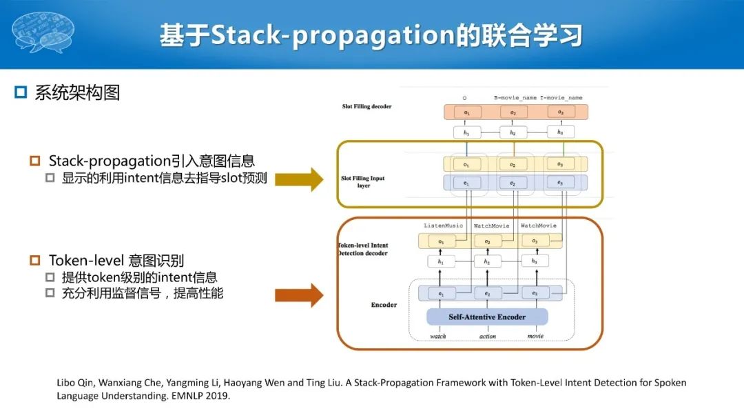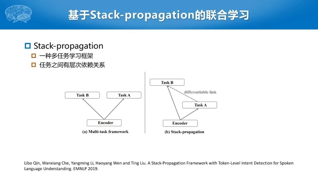因此我们提出一种新的多任务学习框架Stack-propagation,改造了传统的多任务学习方法,即找到任务A的同时支撑任务B、使两者产生联系,把任务A的结果输入给任务B,从而完成更好的多任务学习的方式。