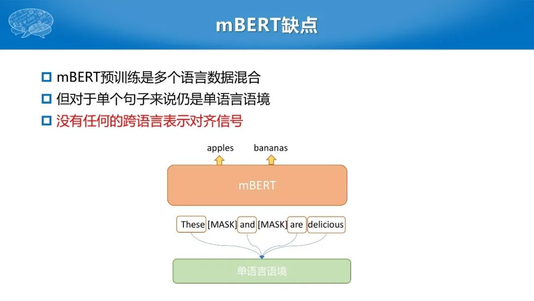 针对跨语言学习,前人用多语言的BERT学习了跨语言共同的分布表示,即把多语言数据直接简单混合、训练一个多语言的mBERT。该方法并没有任何跨语言对齐的信号,上下文仍然是单语言的,因此处理跨语言的任务效果并不好。
