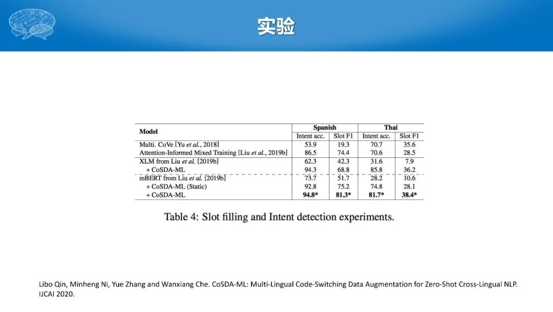 让我们理解下这种方法背后的直觉:最终训练的损失是一样的,但如果输入的语言不同,比如把“eat”换成“吃”,就隐含着学习了两者之间相似的表示,达到了一种跨语言的效果。实验结果显示在西班牙语、泰语等小数据语言上,比传统的方法有20~30个点的明显提升。