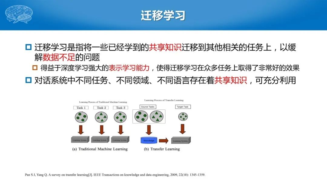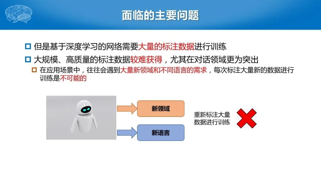 尽管任务型对话系统在深度学习技术的帮助下取得了较大进步,我们仍面临一个问题:大量且高质量的标注数据难以获取。尤其在对话领域,不同的特定领域、新的语言、不同语种的交流以及小语种的迁移,都缺乏相应的数据,标注代价太大。