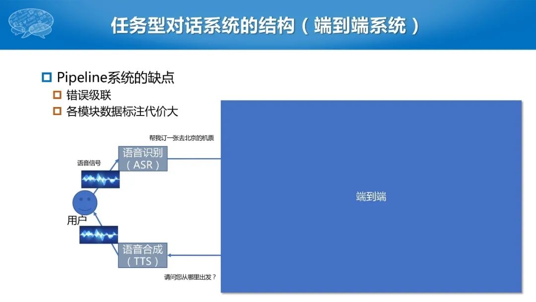 另一方面,各个模块标注的代价也较大。为解决这个问题,NLP研究者们提出端到端的对话,抛开中间的步骤,直接根据用户的输入以及相应的输出训练模型。